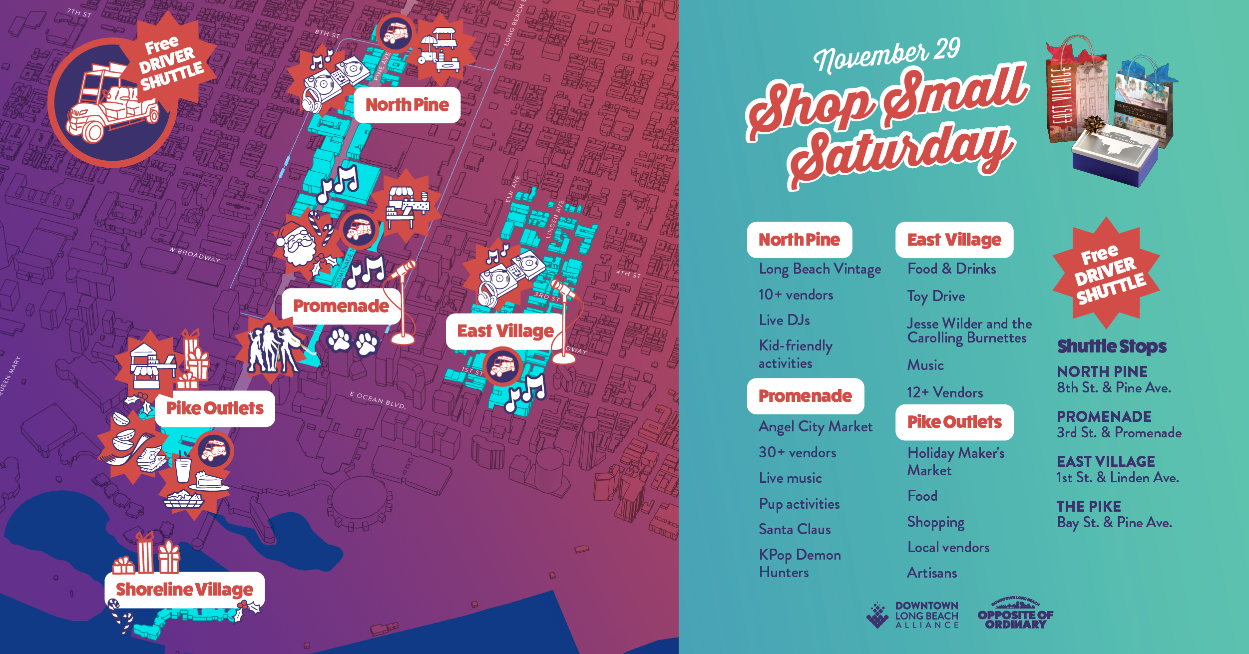 Take the free Driver shuttle and don’t miss shopping small throughout Downtown’s unique neighborhoods! See below for shuttle stops: