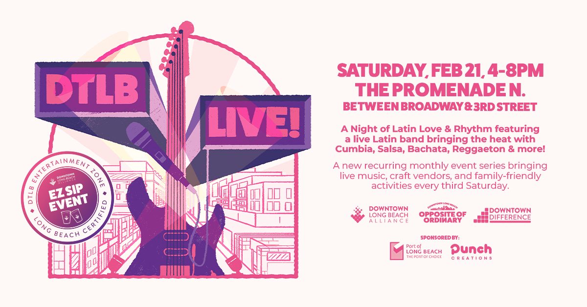 DTLB Live! is our free, recurring monthly event series bringing live music, local craft vendors, and family-friendly activities to the Promenade every third Saturday. February's event will feature a night of Latin love & rhythm featuring a live Latin band bringing the heat with Cumbia, Salsa, Bachata, Reggaeton & more! |